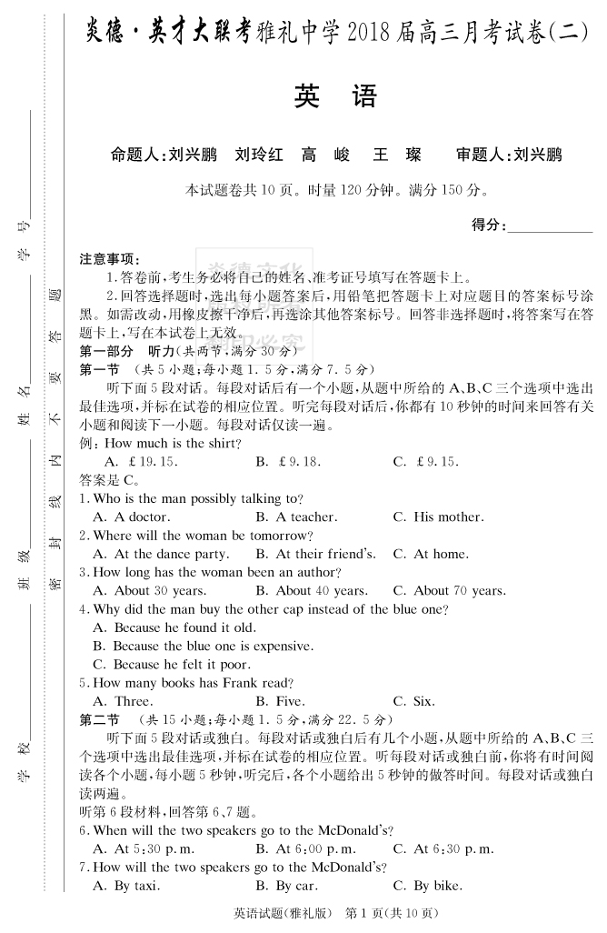【英語】炎德英才大聯(lián)考2018雅禮中學(xué)高三2次月考
