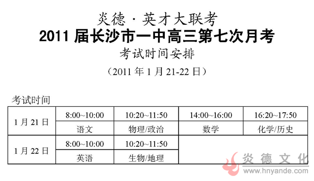 炎德英才大聯考長沙市一中2011屆高三第七次月考考試時間