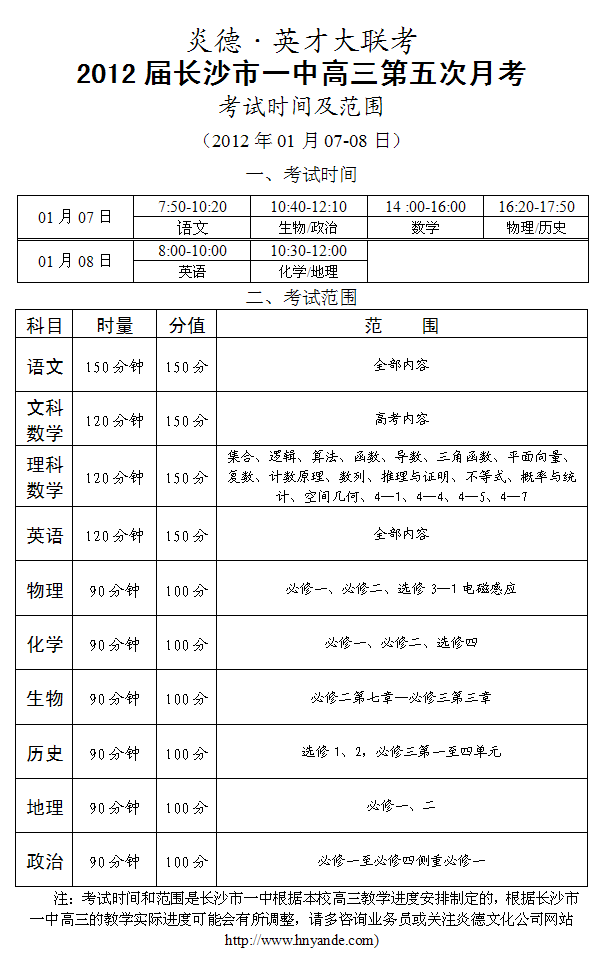 炎德英才大聯考長沙市一中2012屆高三第五次月考考試時間和范圍