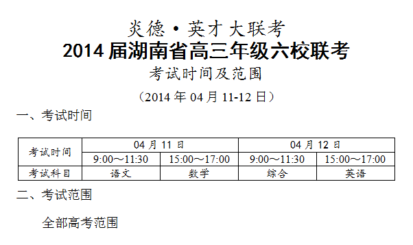 炎德英才大聯考2014屆湖南省高三年級六校聯考考試時間和范圍(2014.04.11-12)