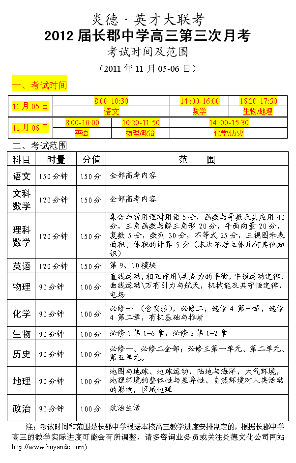 炎德英才大聯考長郡中學2012屆高三第三次月考考試時間和范圍