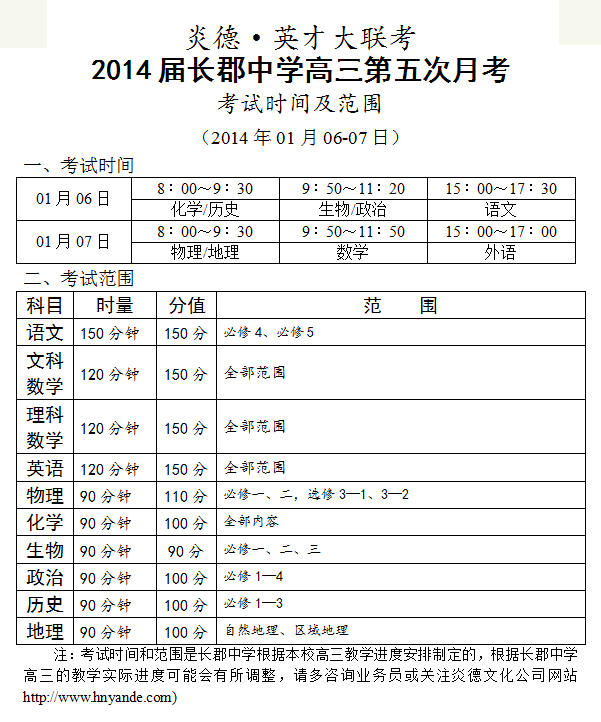 炎德英才大聯(lián)考長(zhǎng)郡中學(xué)2014屆高三第5次月考考試時(shí)間和范圍(2014.01.06-07)