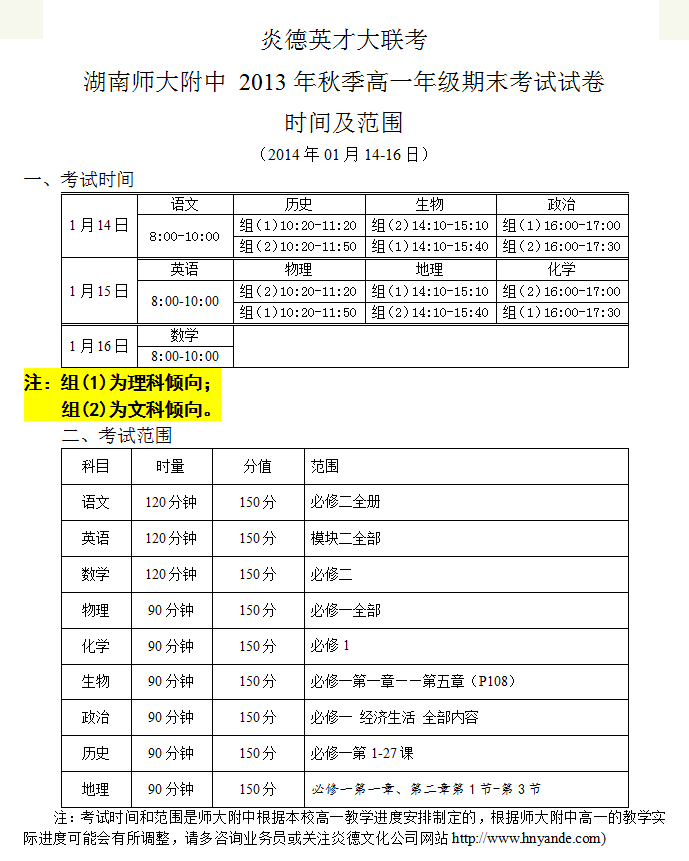 2013年秋季師大附中高一年級期末考試時間及范圍(2014.01.14-16)
