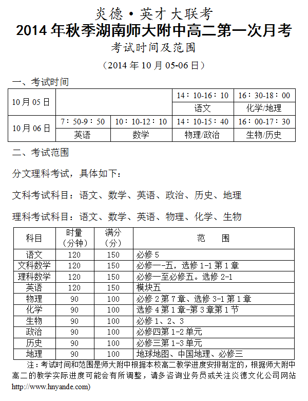 炎德英才大聯考師大附中2014年秋季湖南師大附中高二第一次月考考試時間和范圍(2014.10.05-06)