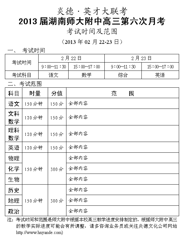 炎德英才大聯考師大附中2013屆高三第六次月考考試時間和范圍