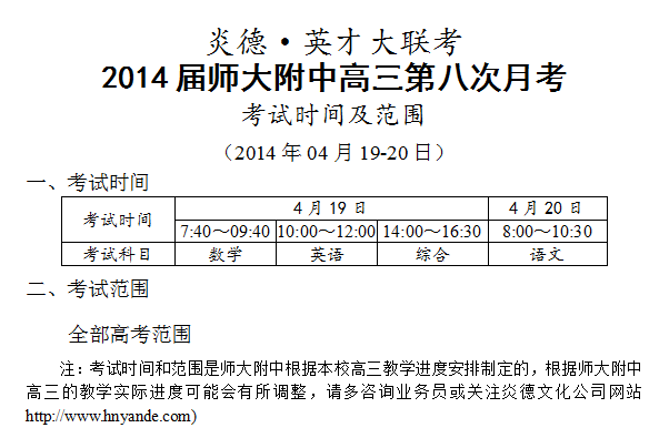 下一篇:炎德英才大聯考師大附中2014屆高三第二次模擬(第9次月考)考試時間和范圍(2014.05.0