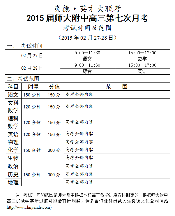 炎德英才大聯(lián)考師大附中2015屆高三第7次月考考試時(shí)間和范圍(2015.02.27-28)