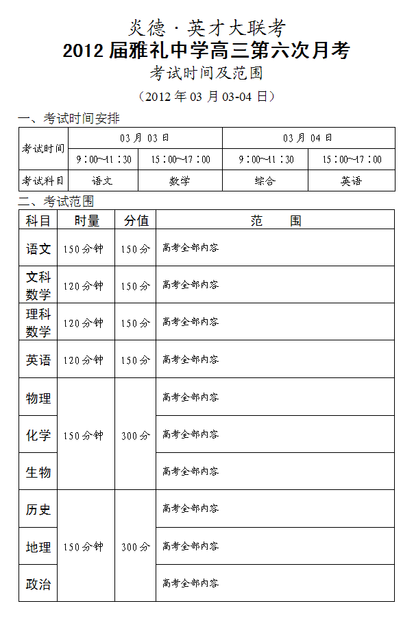炎德英才大聯考雅禮中學2012屆高三第六次月考考試時間和范圍
