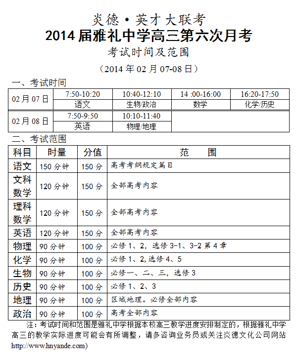 炎德英才大聯(lián)考雅禮中學(xué)2014屆高三第6次月考考試時間和范圍(2014.02.07-08)