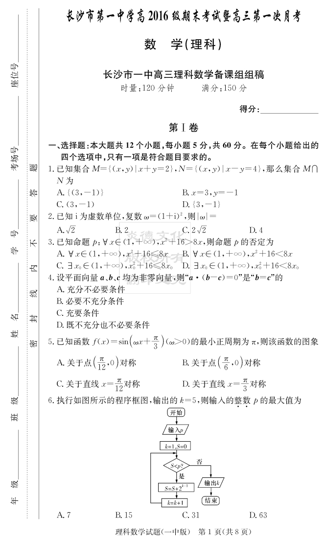 【理數】炎德英才大聯考2019長沙一中高三1次月考