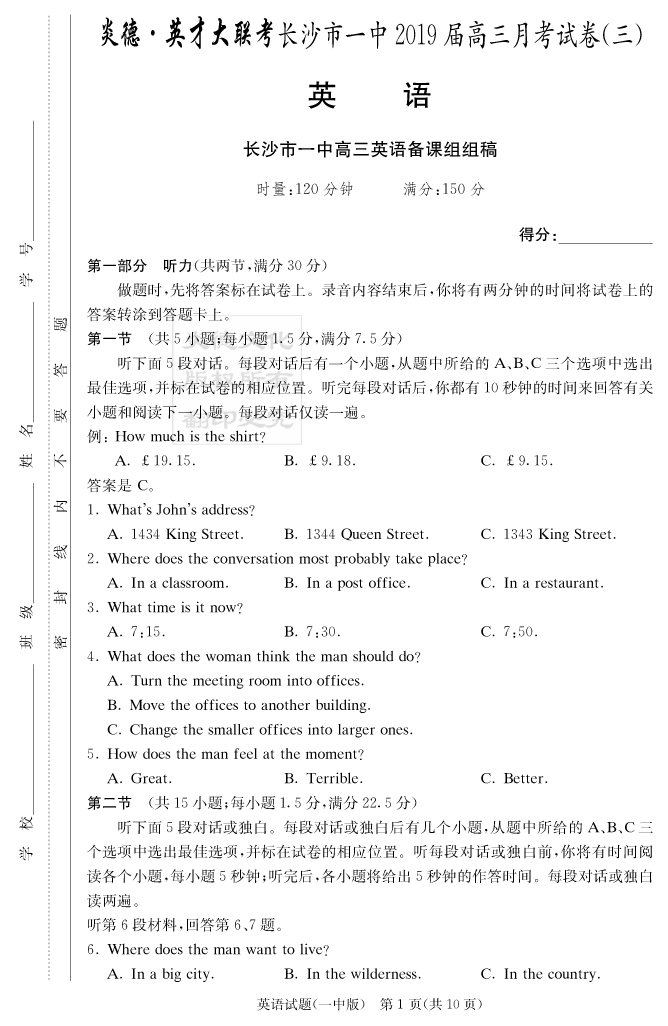 【英語】炎德英才大聯(lián)考2019長沙一中高三3次月考