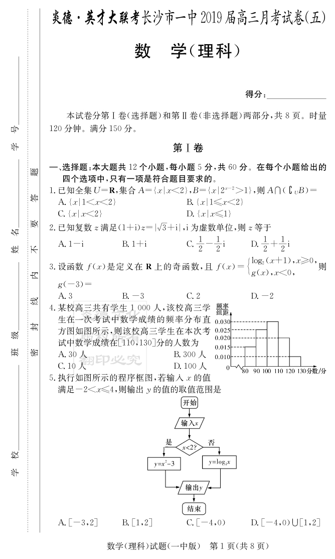 【理數(shù)】炎德英才大聯(lián)考2019長(zhǎng)沙一中高三5次月考