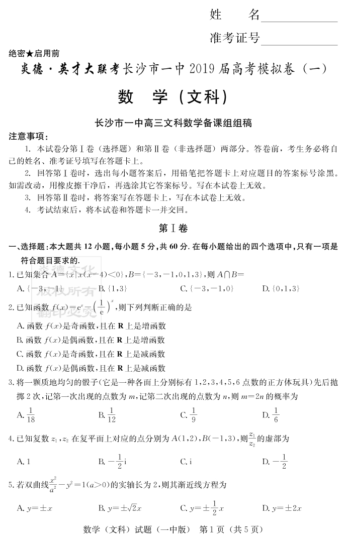 【文數(shù)】炎德英才大聯(lián)考2019長(zhǎng)沙一中高三10次月考(模擬一)