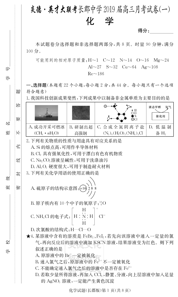 【化學(xué)】炎德英才大聯(lián)考2019長郡中學(xué)高三1次月考