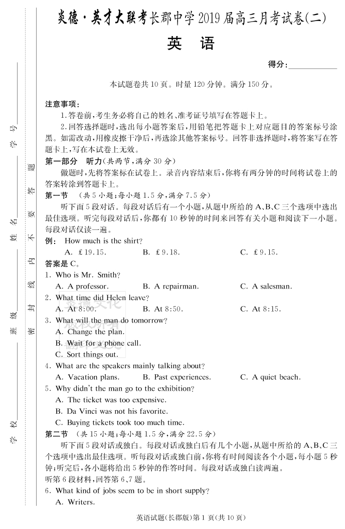 【英語】炎德英才大聯(lián)考2019長郡中學(xué)高三2次月考