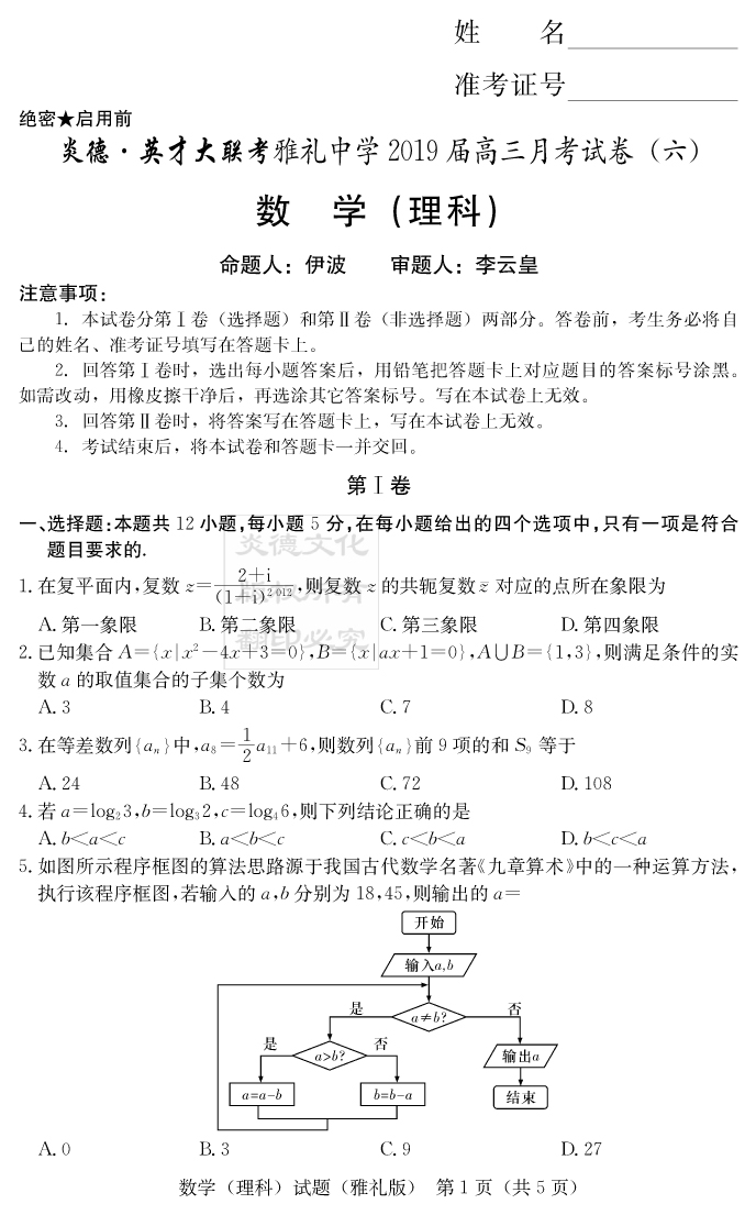 【理數(shù)】炎德英才大聯(lián)考2019雅禮中學(xué)高三6次月考