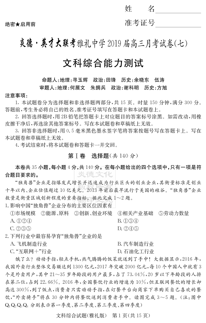 【文綜】炎德英才大聯考2019雅禮中學高三7次月考