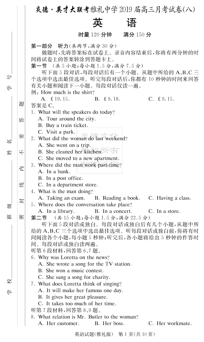 【英語】炎德英才大聯考2019雅禮中學高三8次月考