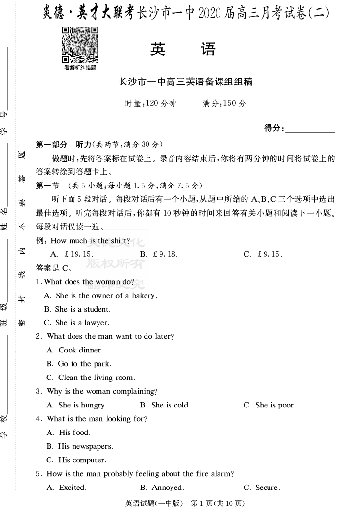 【英語】炎德英才大聯考2020屆長沙市一中高三2次月考