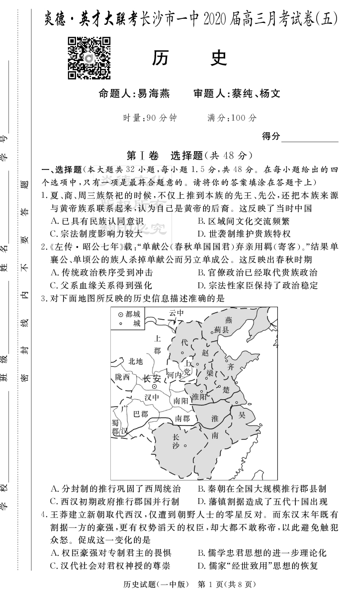 【歷史】炎德英才大聯(lián)考2020屆長沙市一中高三5次月考