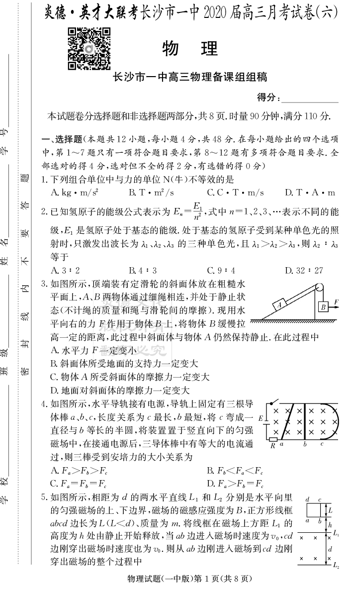 【物理】炎德英才大聯考2020屆長沙市一中高三6次月考