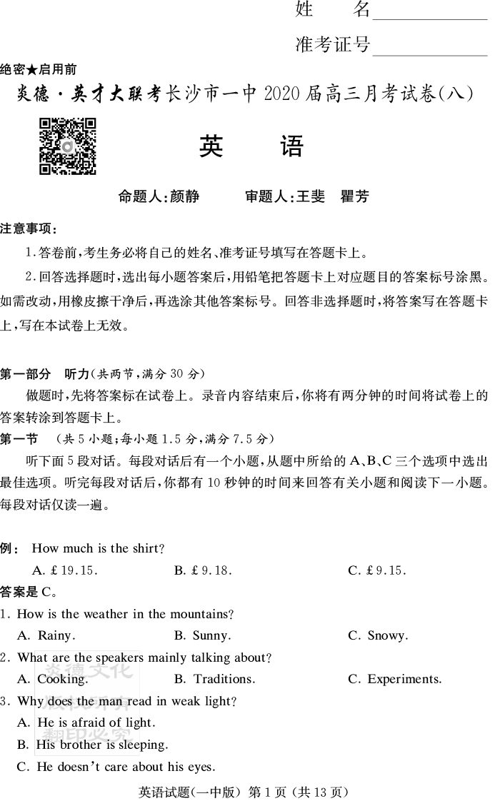 【英語】炎德英才大聯考2020屆長沙市一中高三8次月考