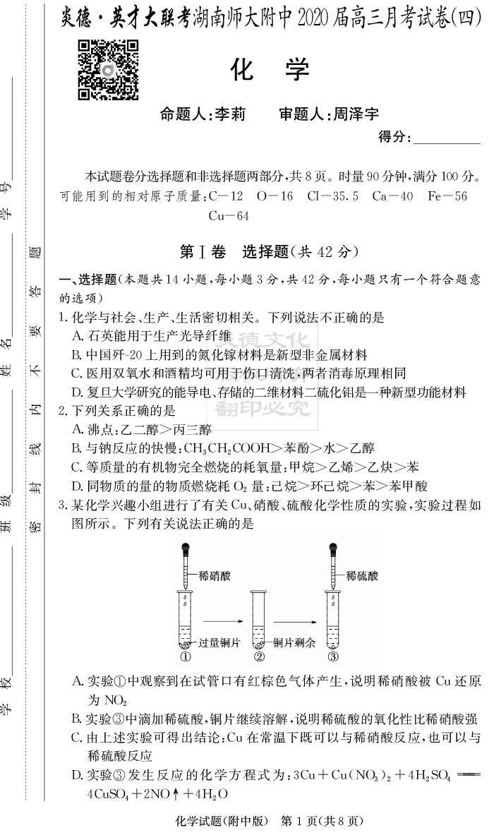 2026名師導學·高考總復習·小題量基礎周周考·化學