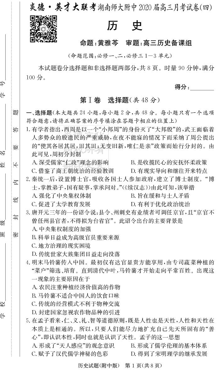 2026名師導學·高考總復習·小題量基礎周周考·歷史