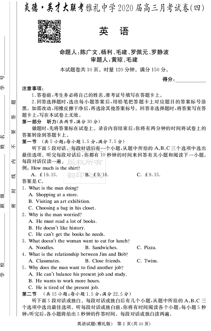 【英語(yǔ)】炎德英才大聯(lián)考2020屆雅禮中學(xué)高三4次月考
