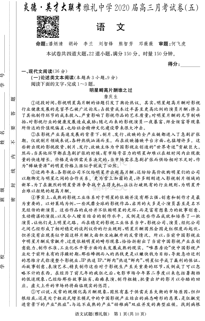 【語文】炎德英才大聯考2020屆雅禮中學高三5次月考