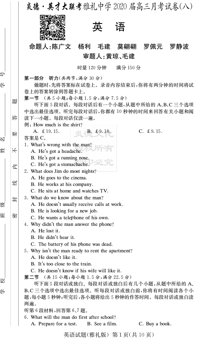 【英語】炎德英才大聯(lián)考2020屆雅禮中學(xué)高三8次月考