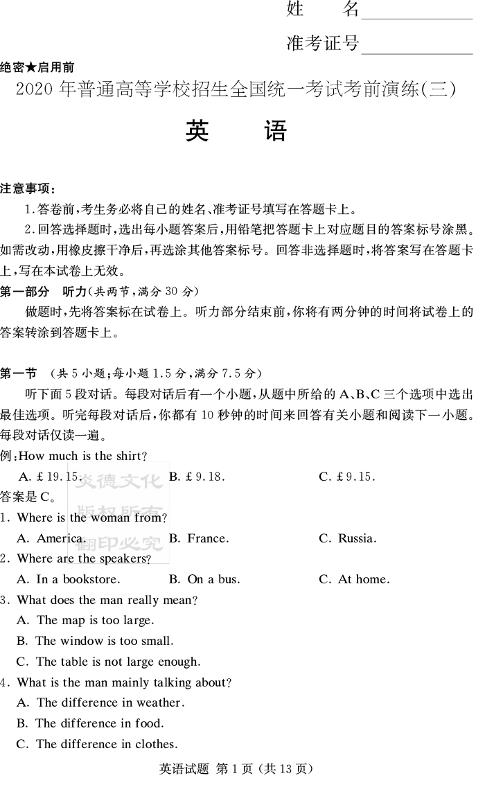 下一篇:【語文】2020年普通高等學校招生全國統一考試考前演練(三)