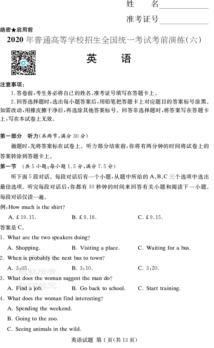 下一篇:【語文】2020年普通高等學校招生全國統一考試考前演練(六)