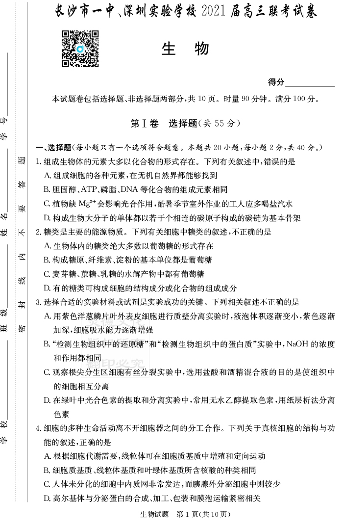 2026高考總復習單元同步滾動測試卷·生物