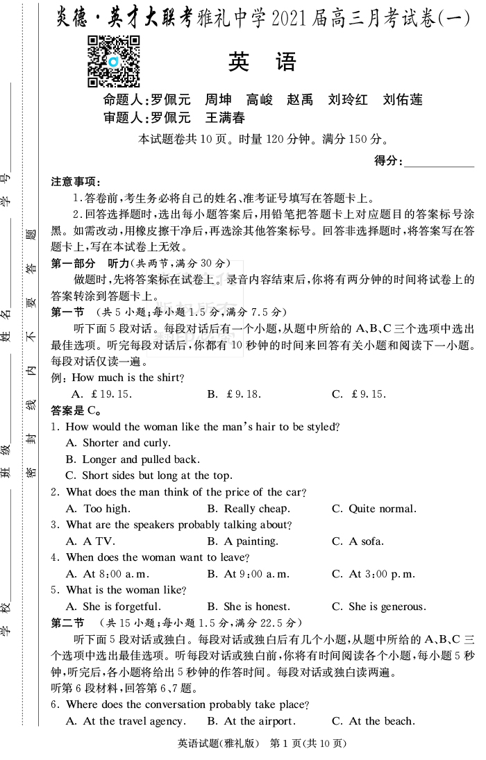 上一篇:【物理】炎德英才大聯考2021屆雅禮中學高三1次月考
