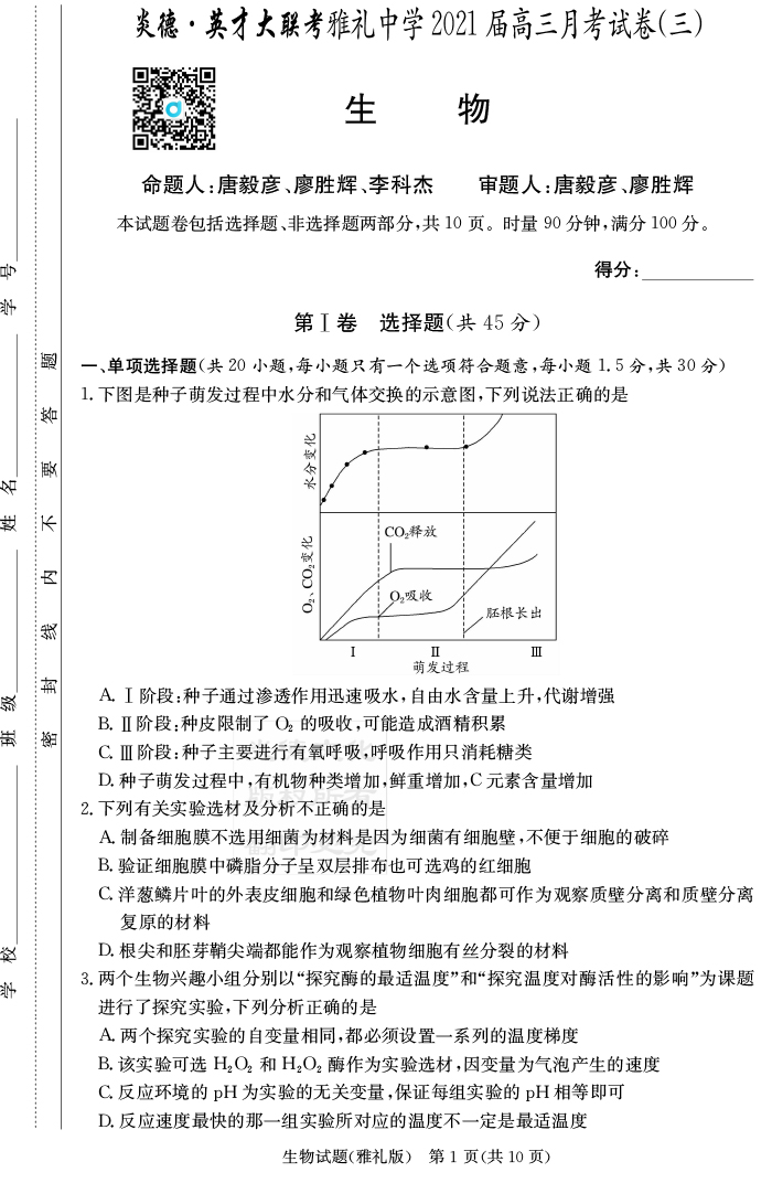 【生物】炎德英才大聯考2021屆雅禮中學高三3次月考