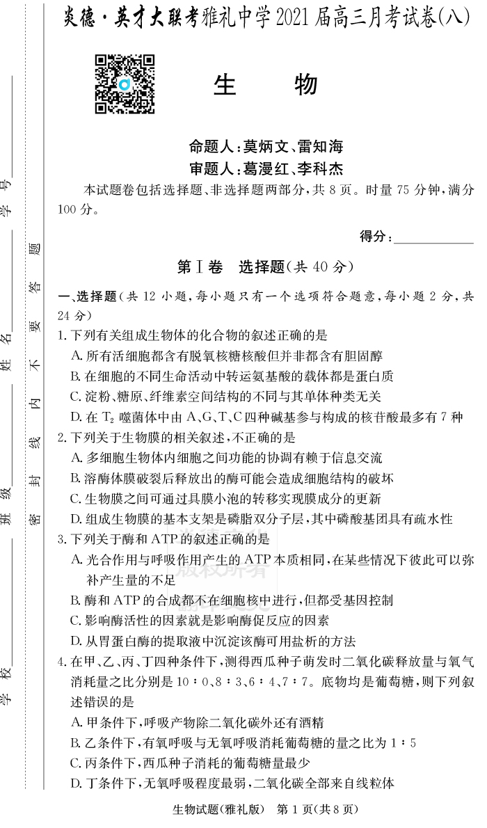 【生物】炎德英才大聯(lián)考2021屆雅禮中學(xué)高三8次月考