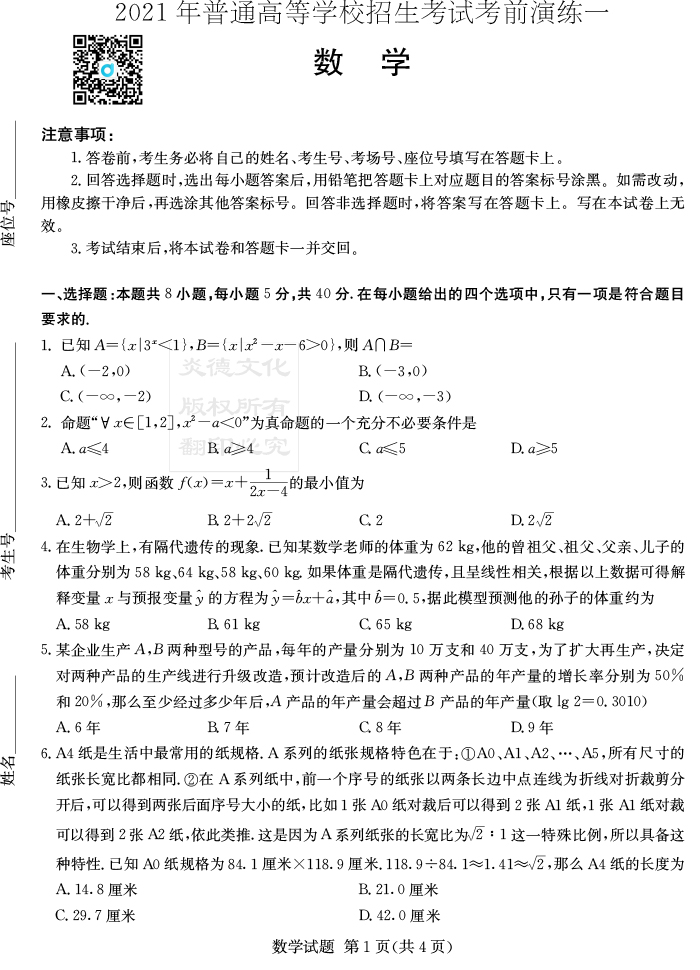 上一篇:【生物】2021年普通高等學校招生全國統一考試考前演練(一)