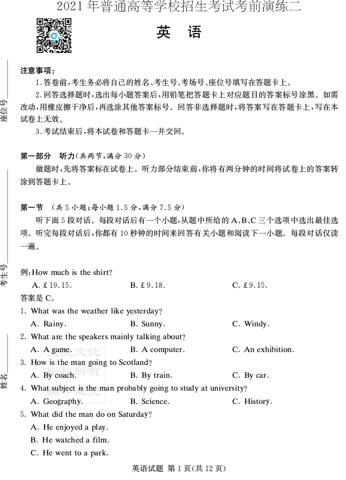 下一篇:【語文】2021年普通高等學校招生全國統一考試考前演練(二)