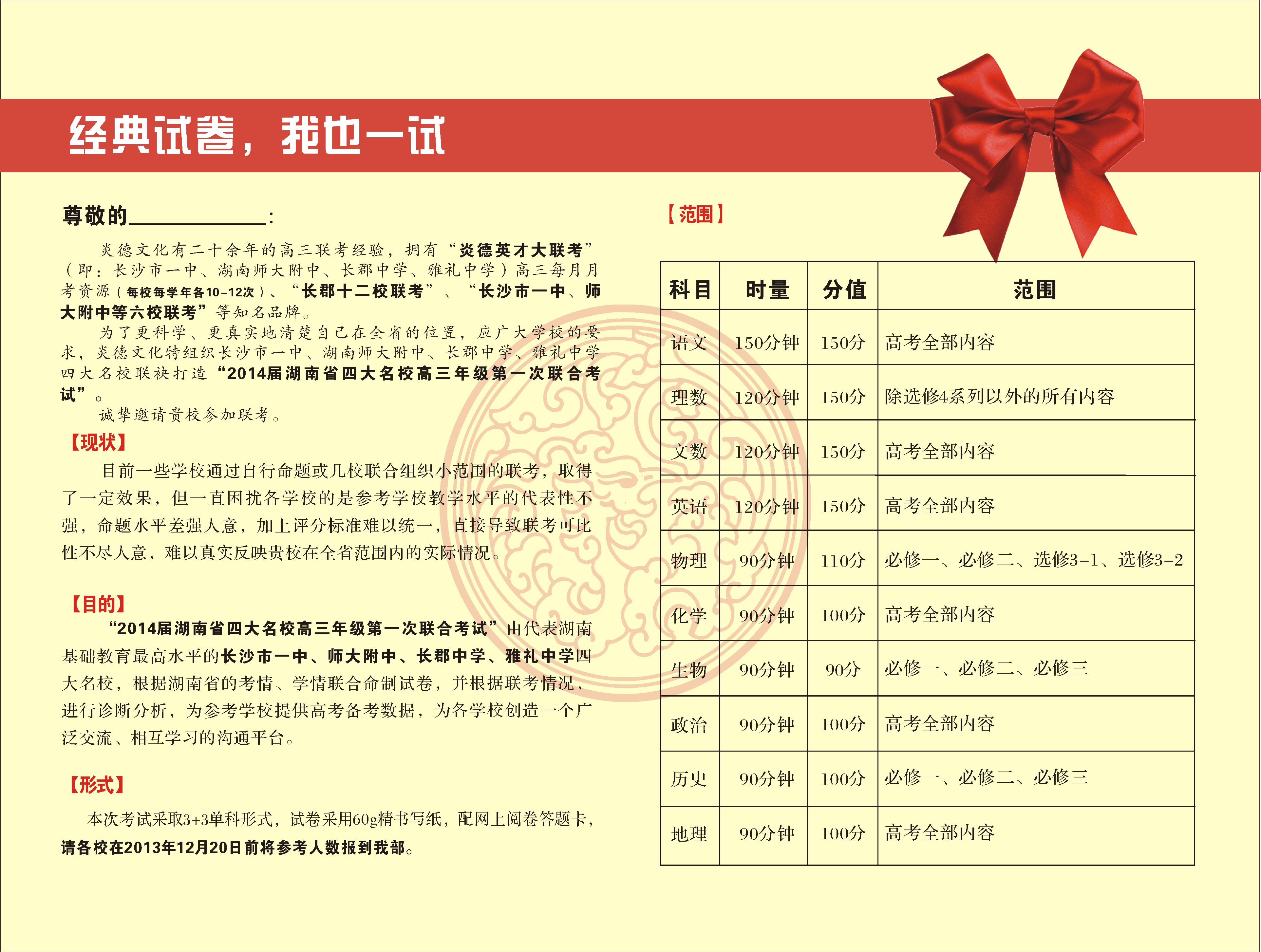 下一篇:炎德英才大聯(lián)考2014屆湖南省高三四校聯(lián)考考試時間安排及范圍(2014.01.19-20)