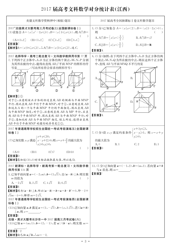 2017高考全國(guó)新課標(biāo)卷Ⅰ對(duì)分表-文數(shù)