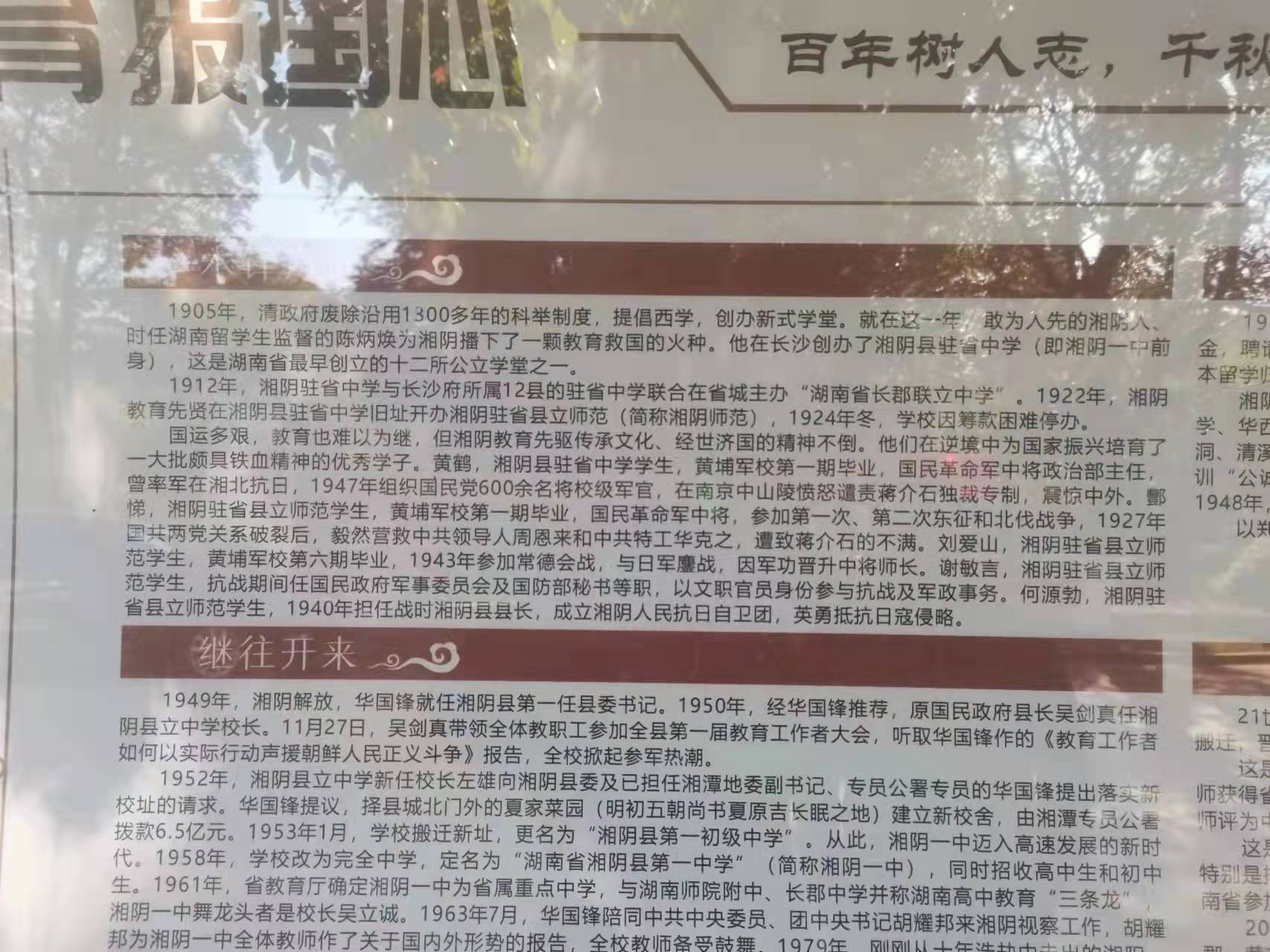 附:湘陰縣第一中學(xué)創(chuàng)建于1905年(清光緒32年),始稱"湘陰駐省中學(xué)"。當(dāng)時(shí)清政府詔示停止科舉考試,命各省會(huì)及府、州、縣籌設(shè)高等、中等、初等學(xué)堂。湘陰縣教育先輩陳炳煥、仇道南等率先興新學(xué),租賃長(zhǎng)沙市南正街唐宅作臨時(shí)校舍,招收甲班學(xué)生80名。同年12月,購(gòu)置長(zhǎng)沙市北門口羅湘里周幾天房屋改作校舍。